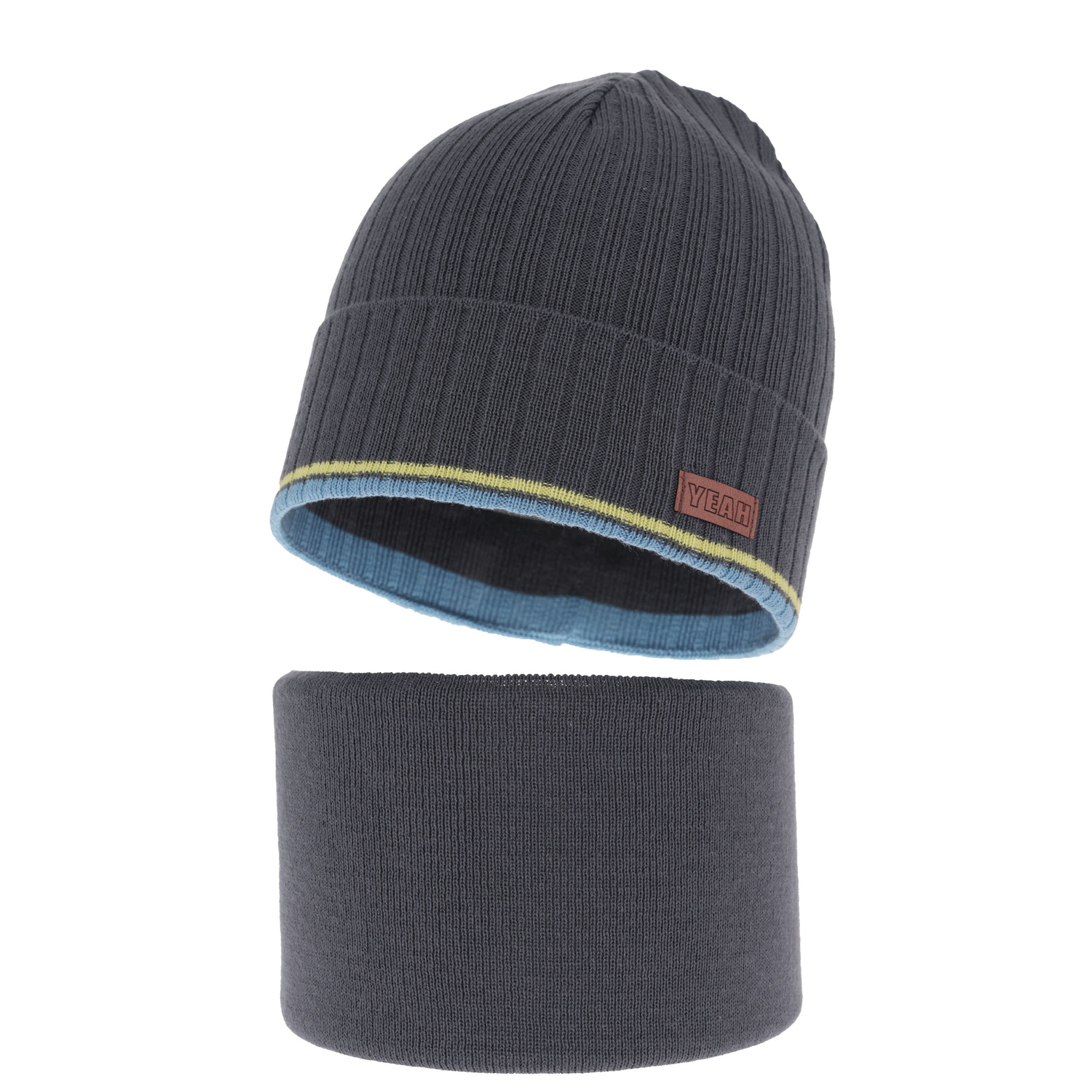 Die Mütze wurde speziell für aktive Jungen entwickelt - das elastische Material passt sich perfekt dem Kopf an, ohne zu drücken. Der charakteristische Aufnäher mit "YEAH"-Schriftzug verleiht dem Ganzen einen modernen, urbanen Charakter, und die dekorativen Streifen am unteren Rand der Mütze vervollständigen das einzigartige Design.